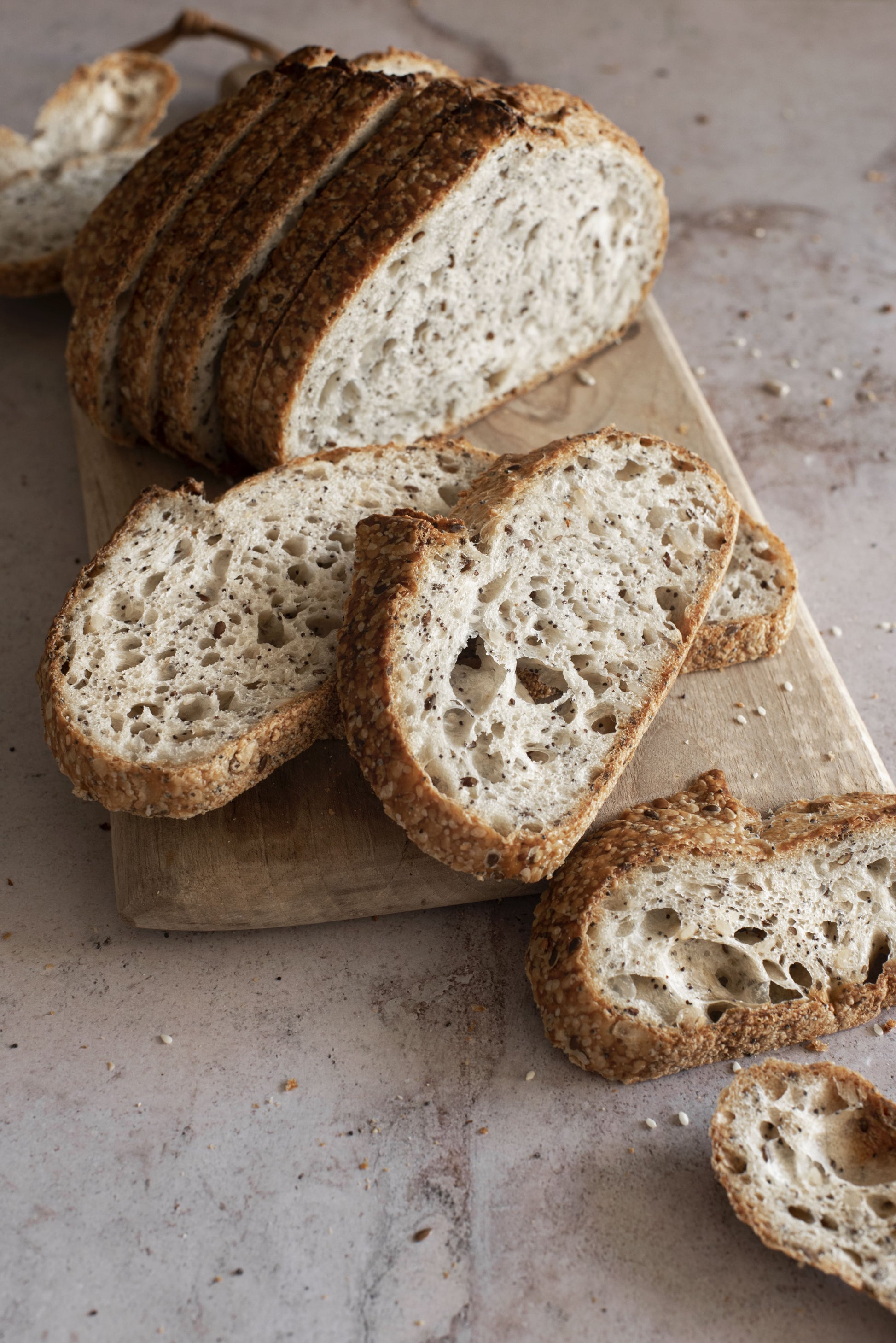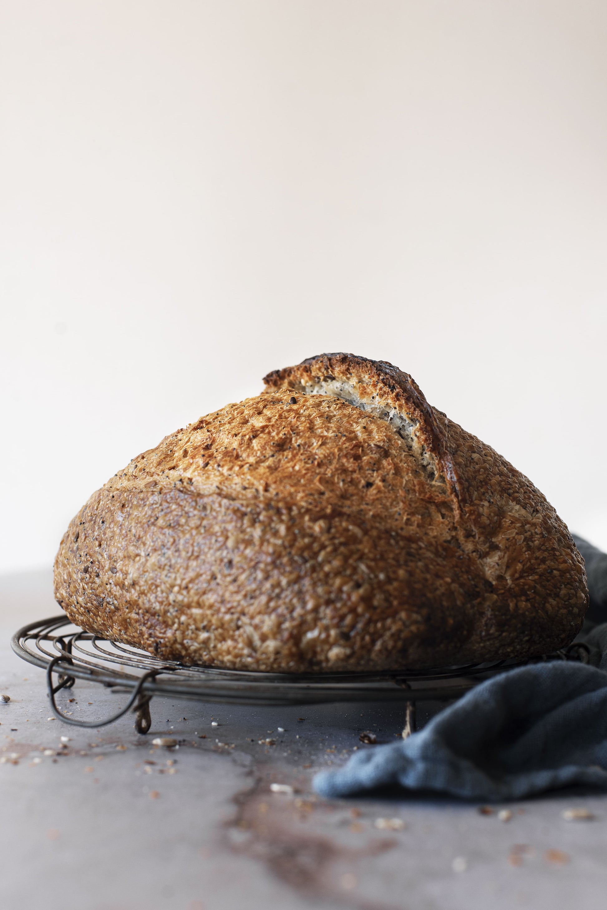 Hogaza de masa madre natural de trigo blanco ecológico con una mezcla de sésamo, linaza, amapola y girasol.